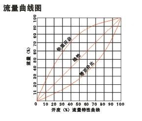 上圖為該種閥門的流量特性曲線,本廠生產(chǎn)的是其中等百分比特性閥門。從曲線圖上可知給開度一個(gè)相等的變化率,則流量的變化率相等,其特點(diǎn)是開度大時(shí)流量大,開度小時(shí)則流量小。而工程中大都在流量大時(shí)應(yīng)用,等百分比閥門恰恰適用這個(gè)要求。根據(jù)這一特點(diǎn),可以自如的予置某更高量(快開閥門和線性閥門則不具備這種功能)而且當(dāng)需要變化時(shí),還能知道變化量,達(dá)到理想狀態(tài)。