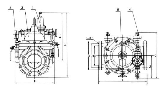 當閥門從進口端給水時,水流過針閥進入主閥控制室,出口壓力通過導管作用到導閥上。當出口壓力高于導閥彈簧設定值時,導閥關閉。控制室停止排水,此時主閥控制室內(nèi)壓力升高并關閉主閥,出口壓力不再升高。